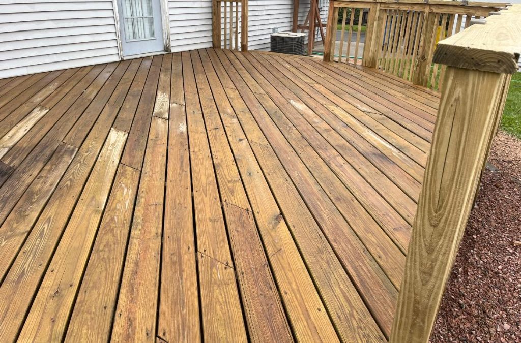 Wood decks need regular maintenance. Skip it for a few years and they look like driftwood. We restore weathered decks through power washing (removes dirt, mildew, gray oxidation), sanding (smooths splinters and rough spots), staining or sealing (protects wood and restores color), and repair of minor damage before refinishing.