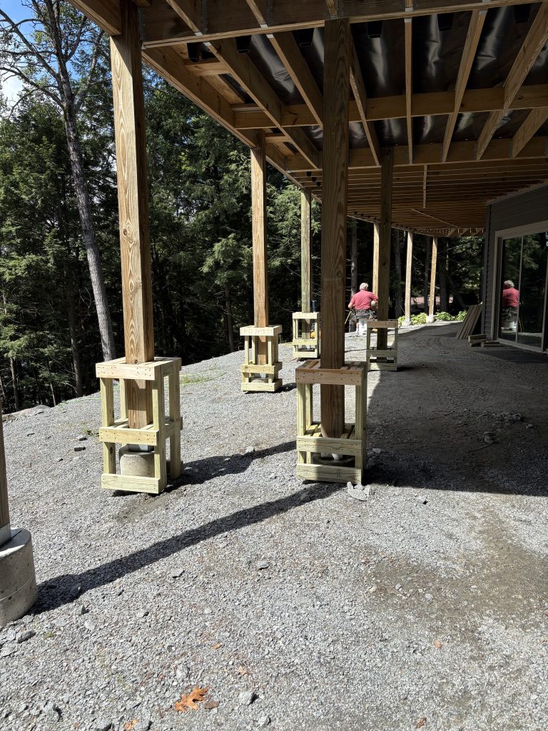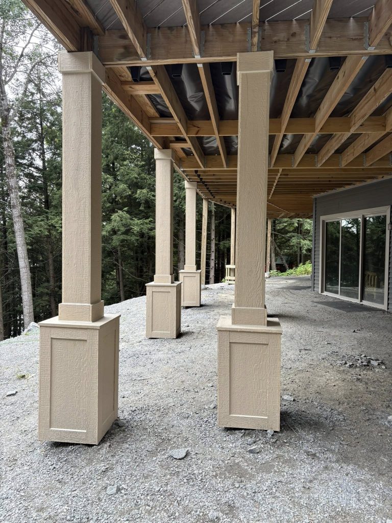 Our crew shows up on schedule, excavates for footings, pours concrete footings below frost line, builds framing to code, installs decking and railings, constructs stairs, and handles all inspections.
