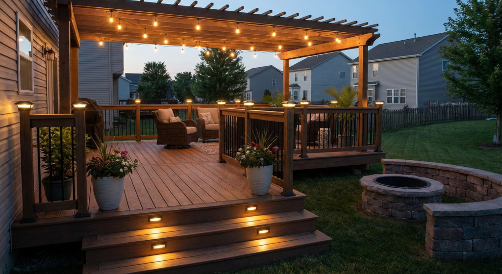 Outdoor lighting extends deck use into evening and improves safety. We install post cap lights, recessed stair lights, under-rail lighting, in-deck LED lights, and low-voltage landscape lighting around deck perimeter.