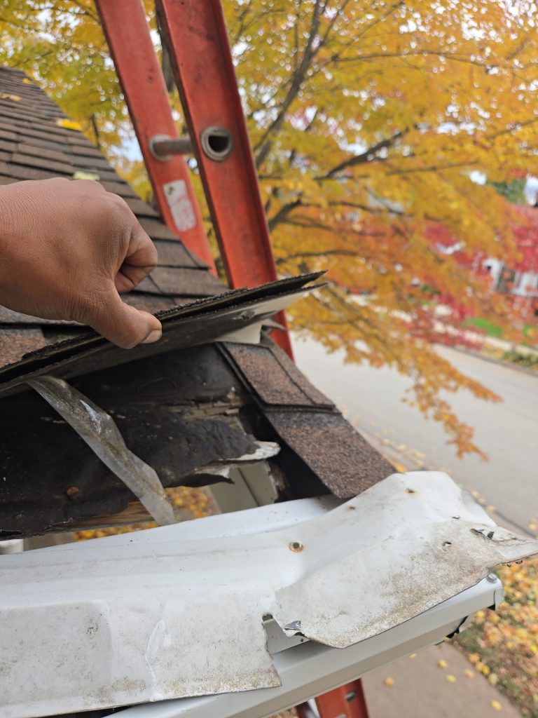 We remove existing gutters carefully to avoid fascia damage, inspect fascia condition after removal, note and explain any rot or damage found, and haul away old gutters and debris.