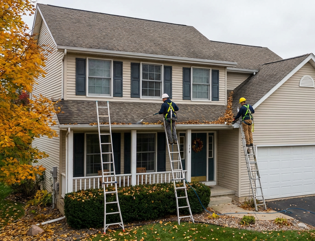 Fall cleaning (essential): Late October or early November after leaves drop. Absolutely critical in Wisconsin—leaf-clogged gutters freeze solid in winter and cause ice dams and gutter damage.