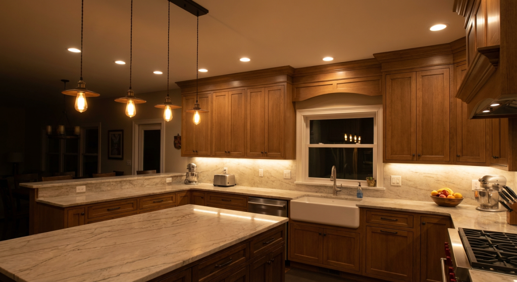 Dark kitchens are depressing. Kitchens without enough outlets are frustrating. We fix both. Electrical panel upgrades, dedicated circuits for appliances, GFCI outlets where code requires them, under-cabinet LED lighting, pendant lights over islands, recessed lighting for general illumination, and dimmers so you’re not cooking under interrogation-level brightness.