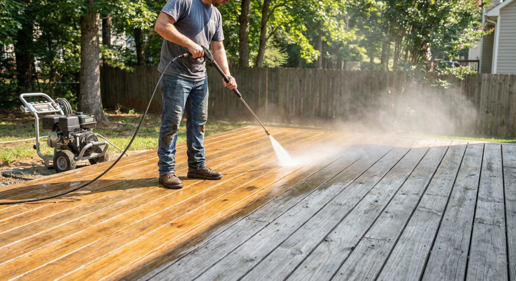 Wood decks turn gray from UV exposure and embedded dirt. Not natural weathering—actual dirt plus mildew plus degraded wood fibers.