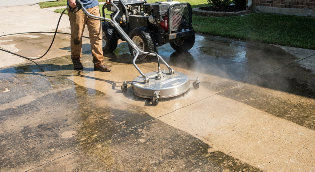 Oil stains – From parked cars, oil changes, power equipment. Surface oil comes off easily. Old embedded oil needs degreaser and high pressure.