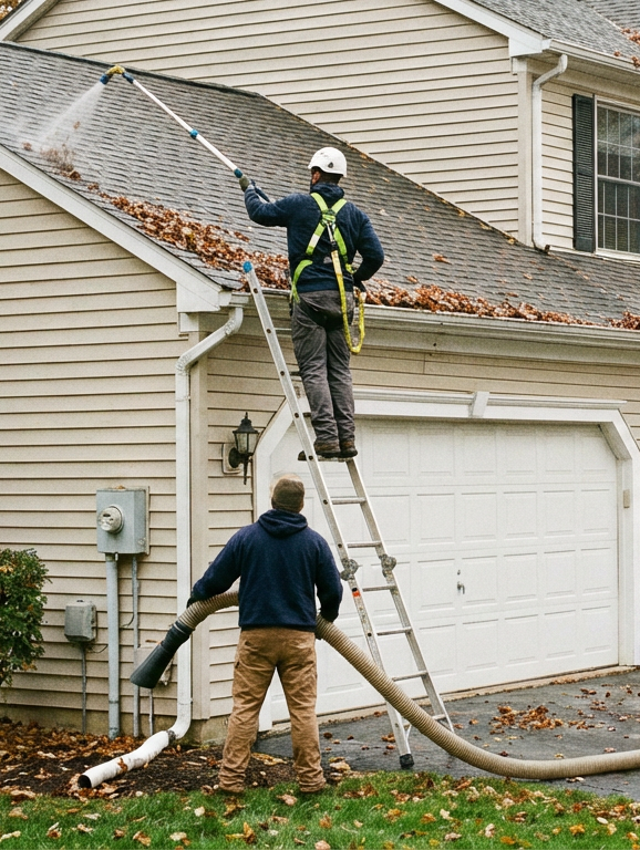 We wash gutter exteriors when washing siding. Minimal extra cost since we’re already there with equipment and scaffolding.