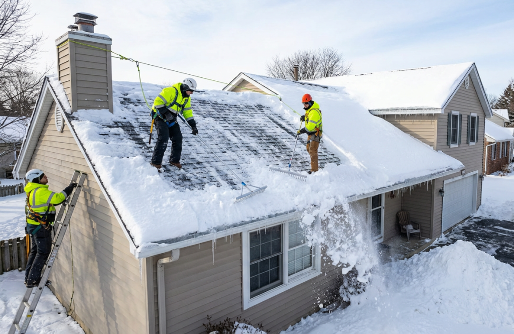 Heavy snow loads threaten structural integrity, cause ice dams that leak into your home, and create dangerous conditions when snow slides off unexpectedly. We provide roof snow removal using proper techniques that don’t damage shingles or roofing materials. Roof snow removal makes sense after heavy snowfall (12+ inches), for flat or low-slope roofs that don’t shed snow naturally, older buildings with questionable structural capacity, and situations where ice dams are causing leaks or damage.